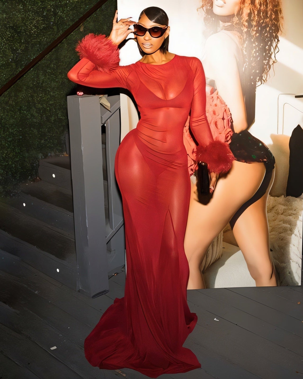 Turn heads in the Ella Maxi Dress, a sultry fusion of sheer allure and playful drama. Crafted in figure-hugging mesh, it skims every curve while long sleeves finish with bold faux feather cuffs for a statement flourish. The floor-grazing silhouette and subtle train add instant glamour.